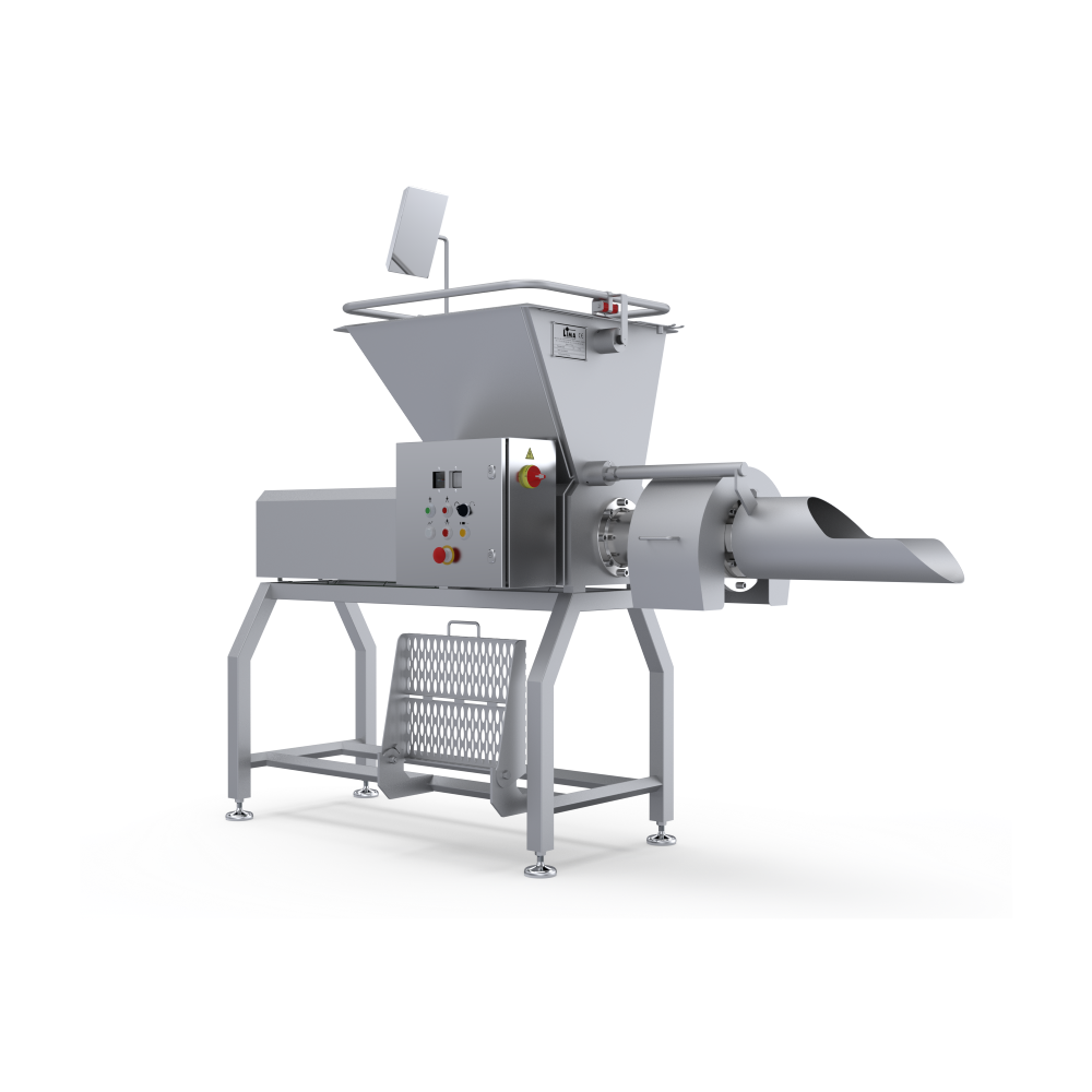 Specifically, LIMA SM machines are equipped with a pre-breaking arm which enables to feed the hopper with raw materials of big dimension without having to pre-cut them, e.g. whole turkey or big turkey carcasses. This arm acts as well as an anti-bridging one enabling to run the machine with a hopper completely filled with raw materials.