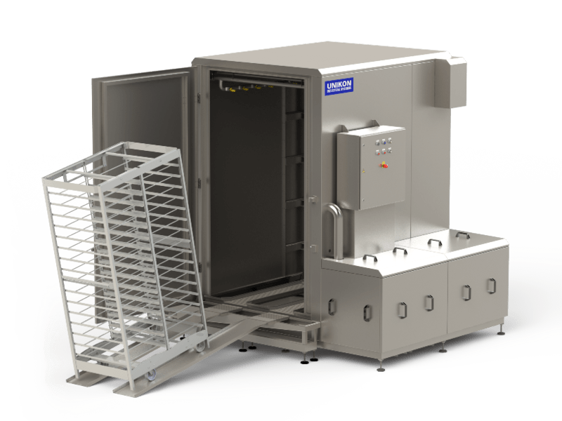 It does not matter what kind of trolley you use, you can clean them in a UNIKON trolley washer. Using advanced cleaning techniques, we are able to clean all types of trolleys quickly and efficiently on all sides. We apply a moving wash frame that is fitted with nozzles on four sides. Washing time and washing power are then matched to the required cleaning.